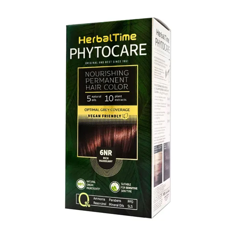 Herbal Time Phytocare, farba do włosów 6NR, rich mahogany – wegańska formuła o żelowej konsystencji, wzbogacona o 10 ekstraktów roślinnych i 5 naturalnych olejków, zapewniająca trwałą i kompleksową koloryzację. Dzięki ponad 90% składników pochodzenia naturalnego, nie zawiera amoniaku, PPD, rezorcyny, SLS, parabenów ani olejów mineralnych, co czyni ją idealnym wyborem dla osób z wrażliwą skórą głowy.