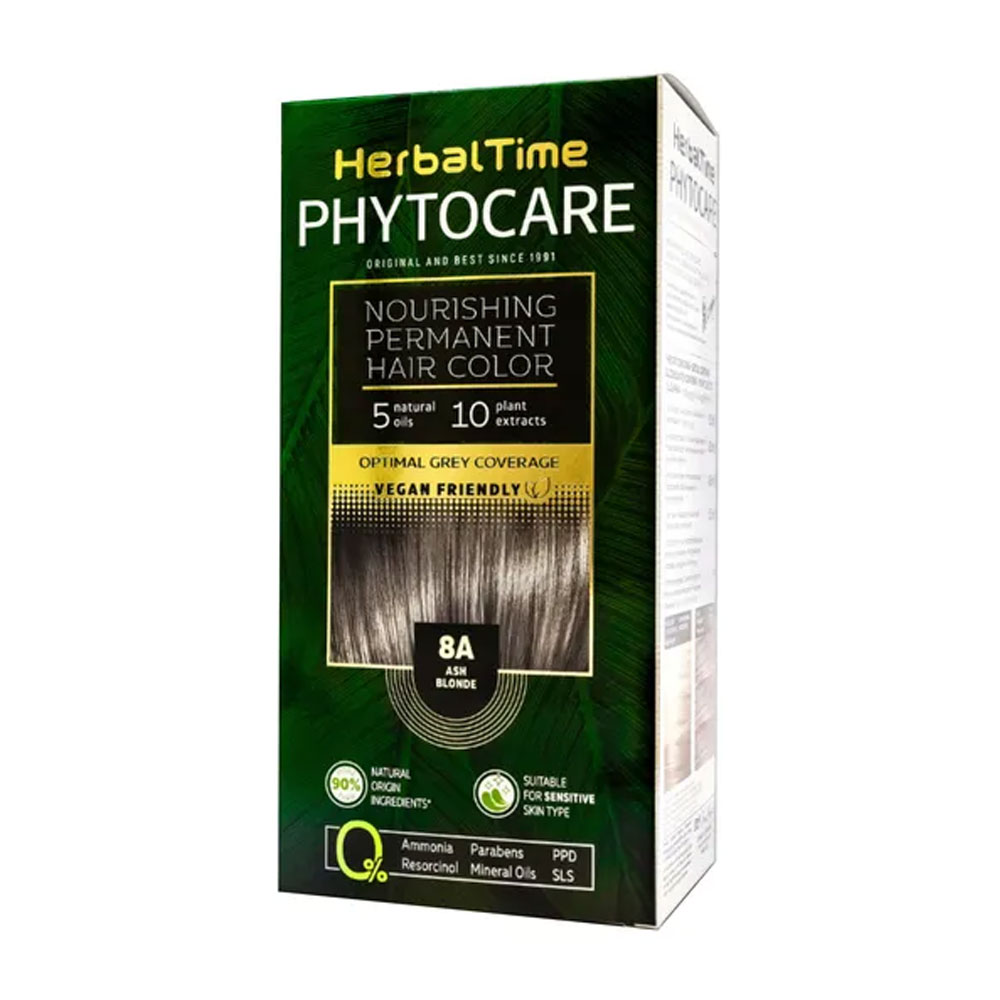 Herbal Time Phytocare, farba do włosów 8A, ash blonde – wegańska formuła o żelowej konsystencji, wzbogacona o 10 ekstraktów roślinnych i 5 naturalnych olejków, zapewniająca trwałą i kompleksową koloryzację. Dzięki ponad 90% składników pochodzenia naturalnego, nie zawiera amoniaku, PPD, rezorcyny, SLS, parabenów ani olejów mineralnych, co czyni ją idealnym wyborem dla osób z wrażliwą skórą głowy.