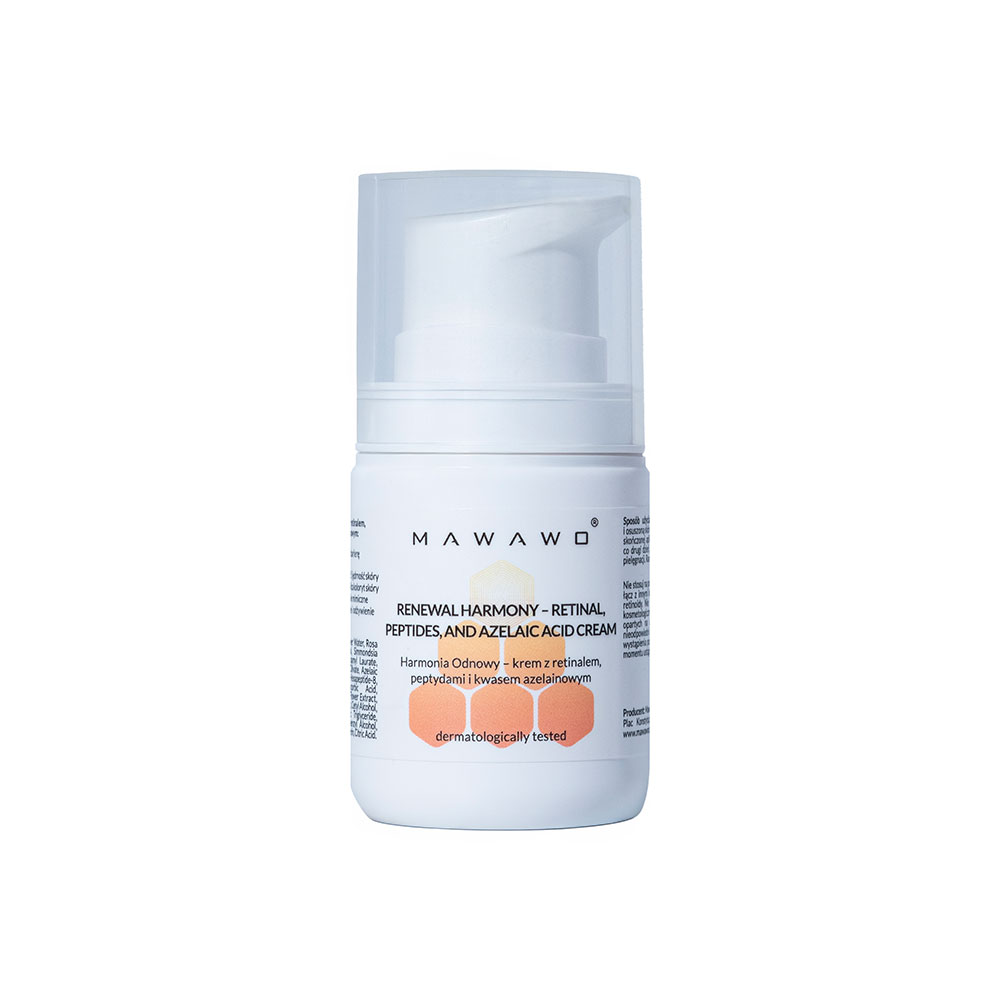 Harmonia Odnowy to krem stworzony dla osób, które poszukują intensywnej pielęgnacji wspierającej naturalną regenerację skóry. Dzięki zawartości 0,02% liposomalnego retinalu, peptydów i kwasu azelainowego, krem działa skutecznie, ale łagodnie, redukując oznaki starzenia i wyrównując koloryt cery. Jego bogata formuła wzmacnia barierę hydrolipidową, przywracając skórze elastyczność, gładkość i zdrowy blask. Regularne stosowanie wspomaga redukcję zmarszczek, nawilża skórę i poprawia jej strukturę, sprawiając, że staje się bardziej promienna i wypoczęta.