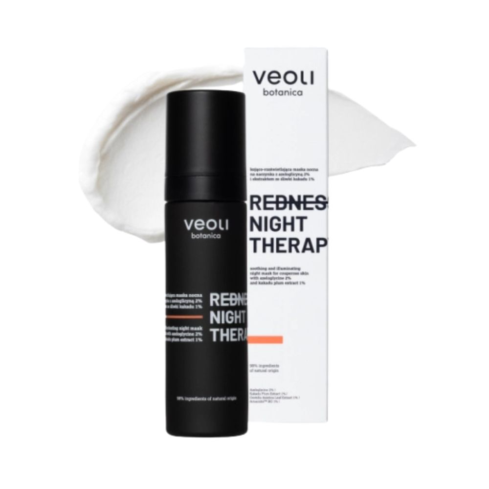 Veoli Botanica REDNESS NIGHT THERAPY to kojąco-rozświetlająca maska nocna stworzona z myślą o cerze naczynkowej, skłonnej do zaczerwienień i podrażnień. Formuła produktu została opracowana tak, aby łagodnie pielęgnować wrażliwą skórę, jednocześnie wspierając jej naturalną regenerację podczas snu.