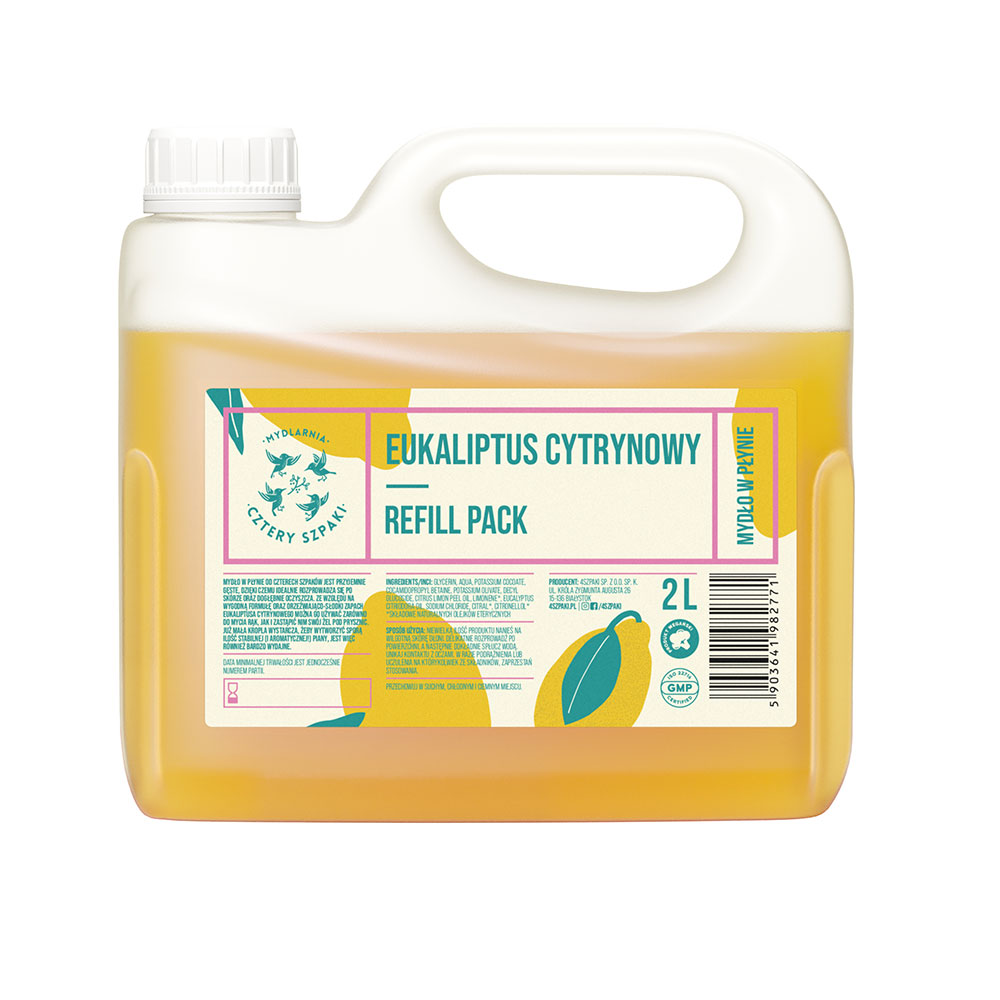 Ingredients/INCI: Glycerin, Aqua, Potassium Cocoate, Cocamidopropyl Betaine, Potassium Olivate, Decyl Glucoside, Citrus Limon Peel Oil, Limonene*, Eucalyptus Citriodora Oil, Sodium Chloride, Citral*, Citronellol*. *składowe naturalnych olejków eterycznych
