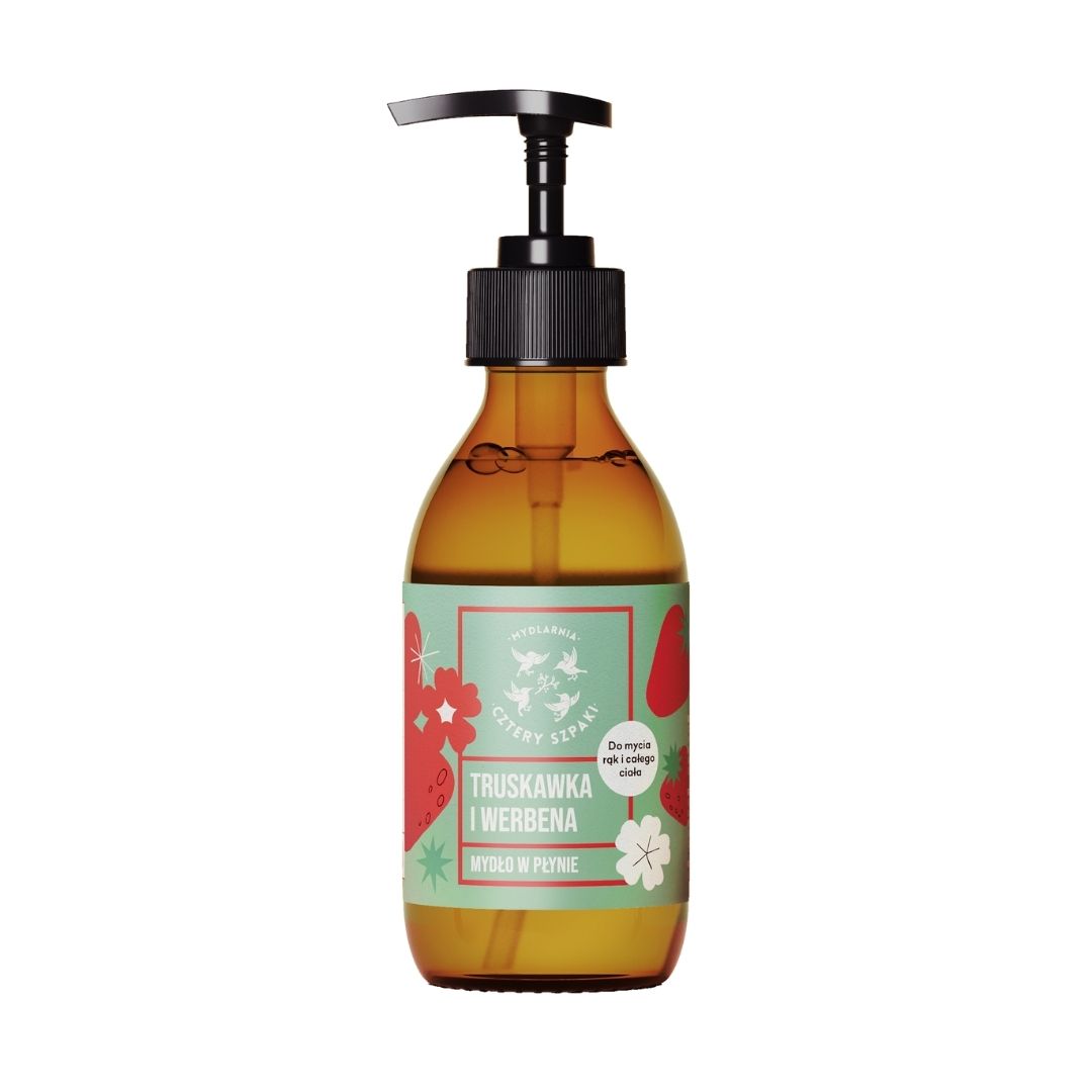 Proces powstawania mydeł w płynie by Cztery Szpaki to swego rodzaju alchemia, wymagająca uważności, skrupulatności i czasu. Polega na łączeniu klasycznej techniki tworzenia mydła z uniwersalnością delikatnych środków myjących - inaczej mówiąc połączeniu wodorotlenku potasu, z klasycznymi, szlachetnymi olejami: kokosowym i oliwą z oliwek. W przypadku Truskawki i Werbeny w bazie wylądował również olej z pestek truskawki. Jest on uznawany za tzw. „suchy olej”, co oznacza, że świetnie sprzyja nawilżeniu, przy jednoczesnej błyskawicznej i łatwej wchłanialności. Olej wziął wziął się też za dogłębne odżywienie i regeneracje skóry, a także łagodzenie podrażnień.
