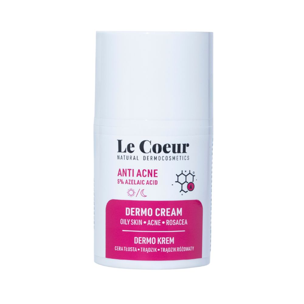 Oczyszczający dermo krem regulujący do twarzy dzięki zawartości 5% kwasu azelainowego wspomaga redukcję zmian trądzikowych i przebarwień oraz odczuwalnie wygładza skórę . 1% glukonianu cynku normalizuje wydzielanie sebum i matowi cerę, a 3% mocznika i ksylitolu zapewnia długotrwałe nawilżenie, pozytywnie wpływając na poprawę napięcia i elastyczności skóry.