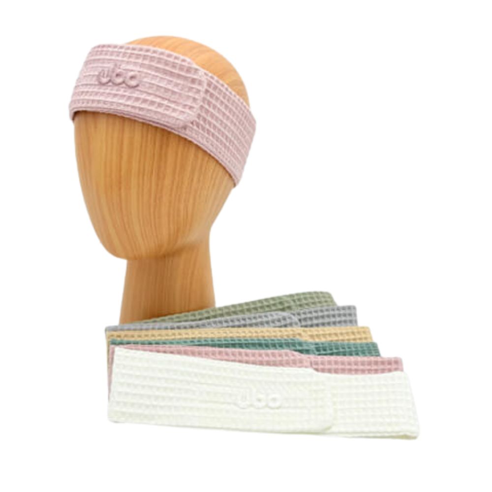 Opaska na włosy uszyta ze 100% polskiej bawełny o splocie waflowym, z praktycznym, szerokim rzepem ułatwiającym regulację.
