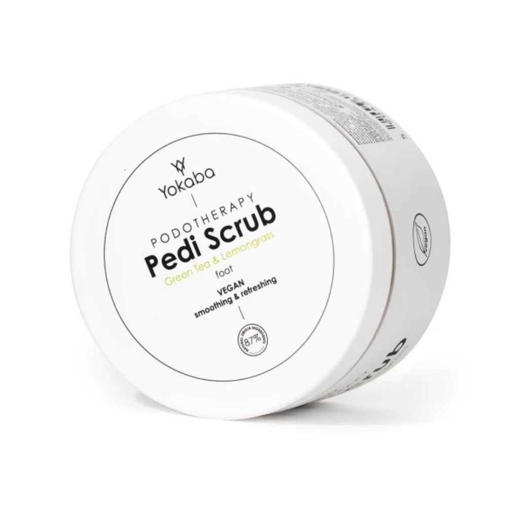 Pedi Scrub Green Tea & Lemongrass Podotherapy to wegański peeling do stóp, który łączy skuteczne złuszczanie z przyjemnością rytuału. Formuła oparta w 87% na składnikach pochodzenia naturalnego wygładza skórę, zmiękcza zgrubienia i przygotowuje stopy na kolejne etapy świadomej pielęgnacji.