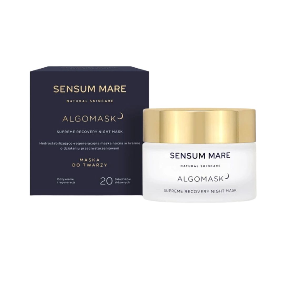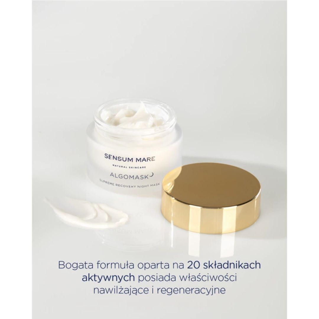 Hydrostabilizująco regeneracyjna maska nocna w kremie ALGOMASK stanowi ukoronowanie innowacji i najwyższej jakości kosmetyków naturalnych SENSUM MARE. Bogata formuła oparta na 20 składnikach aktywnych posiada silne właściwości nawilżające i regeneracyjne, sprawdzi się u osób poszukujących zaawansowanych i bogatych receptur.