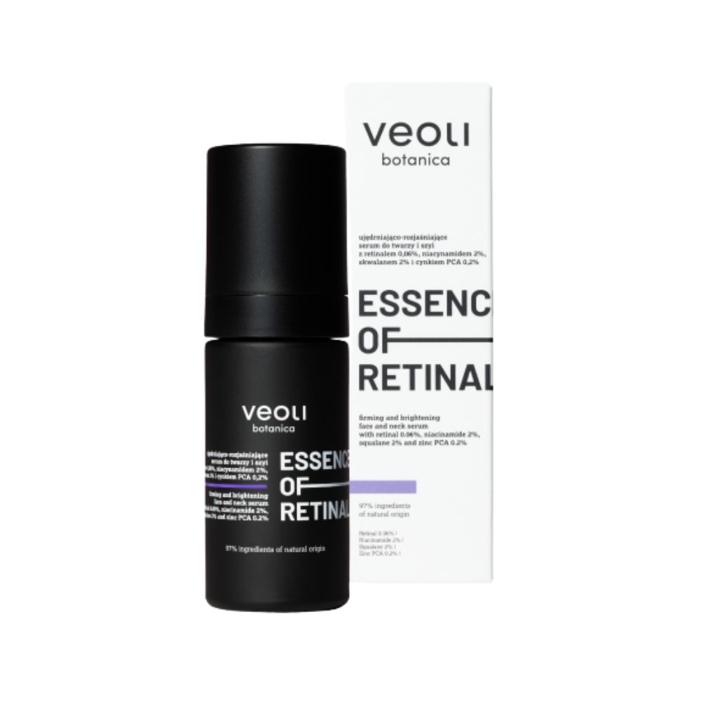 Veoli Botanica ESSENCE OF RETINAL to zaawansowane serum do twarzy i szyi, zaprojektowane z myślą o pielęgnacji skóry z pierwszymi oznakami starzenia oraz nierównym kolorytem. Połączenie retinalu, niacynamidu, skwalanu i cynku PCA wspiera wygładzenie powierzchni skóry, poprawę jej jędrności oraz rozświetlenie cery bez efektu obciążenia.