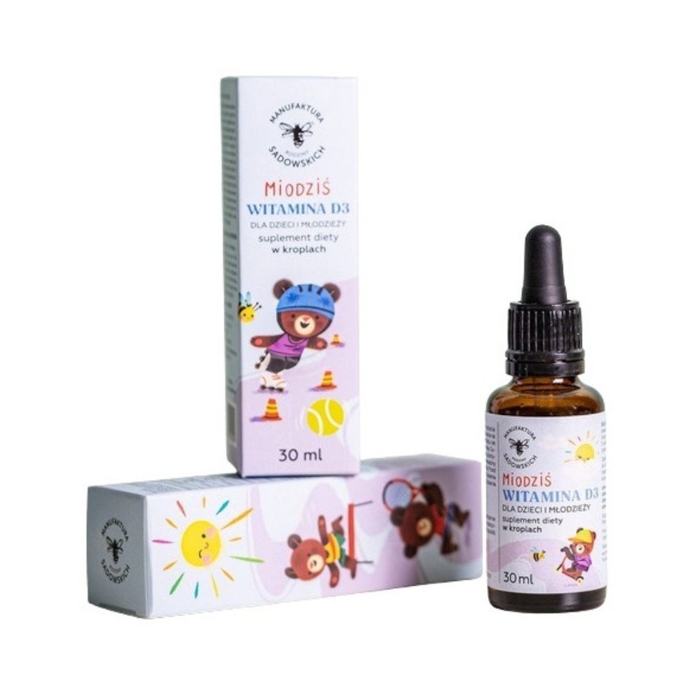 Oto jest - witamina D prosto od Miodzisia! Ten mądry miś niezwykle cieszy się z letnich, słonecznych dni, czerpie wtedy moc witamin prosto z natury, ale doskonale wie, że witaminy D potrzebuje przez cały rok! Długo się głowił nad najlepszą i najwygodniejszą formułą, aż w końcu wymyślił - poznajcie witaminę D dla dzieci i młodzieży w kropelkach! Miś specjalnie wybrał na bazę oliwę - tę ze starannie dobranych oliwek, z pierwszego tłoczenia. Jak zawsze dopilnował, żeby jego suplement był najwyższej jakości, bez “E” dodatków. Tak powstały prawdziwe kropelki mocy, dla każdego! Wygodna w stosowaniu formuła sprawia, że witaminę D można w łatwy sposób podawać zarówno niemowlakom, jak i starszakom! Wszystko w trosce o zdrowy rozwój i wsparcie naturalnej odporności przyjaciół Miodzisia!