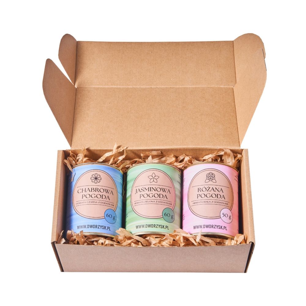 Nowe herbaty z Dworzyska w zestawie Kwiaty Pogody oznaczają, że na niebie przez cały dzień będzie świecić słońce. Już od rana słoneczna aura zielonej herbaty Sencha i pąków jaśminu, zawartych w Jaśminowej Pogodzie sprawią, że niebo będzie jasne i pełne blasku. W ciągu dnia mogą wystąpić lekkie porywy wiatru, które przyniosą orzeźwiający powiew liści mięty spearmint.
